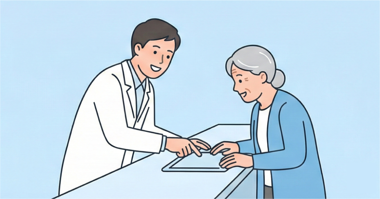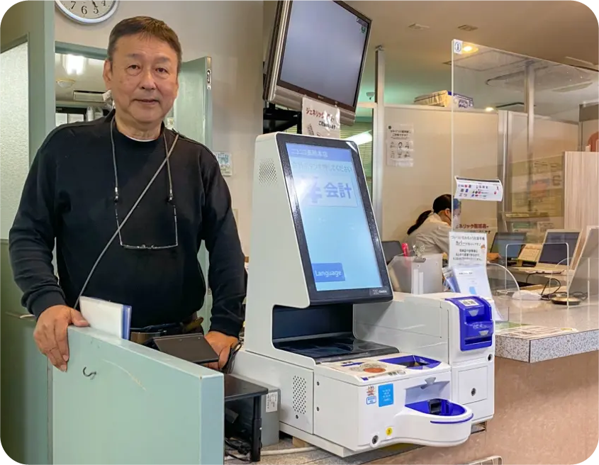 スタッフさん側にも操作画面がある「セミセルフレジ」方式を採用。カウンター越しに患者様の画面を確認できるため、操作に戸惑う高齢の患者様へも自然にサポートが可能です。