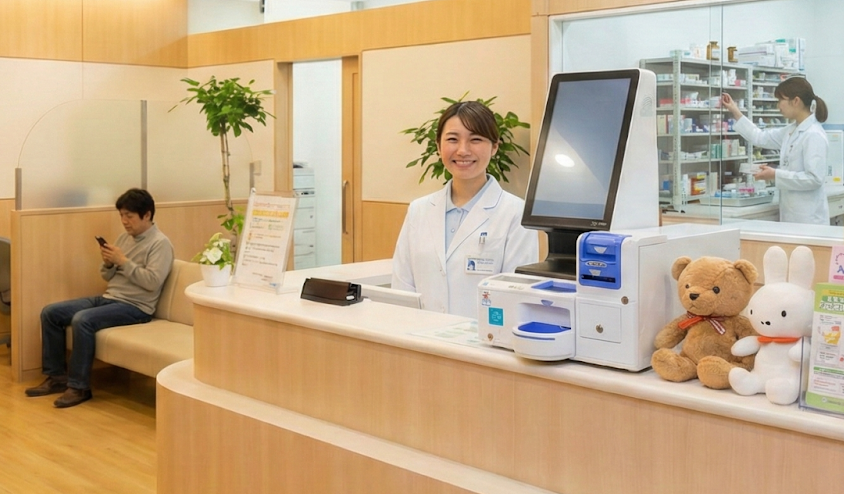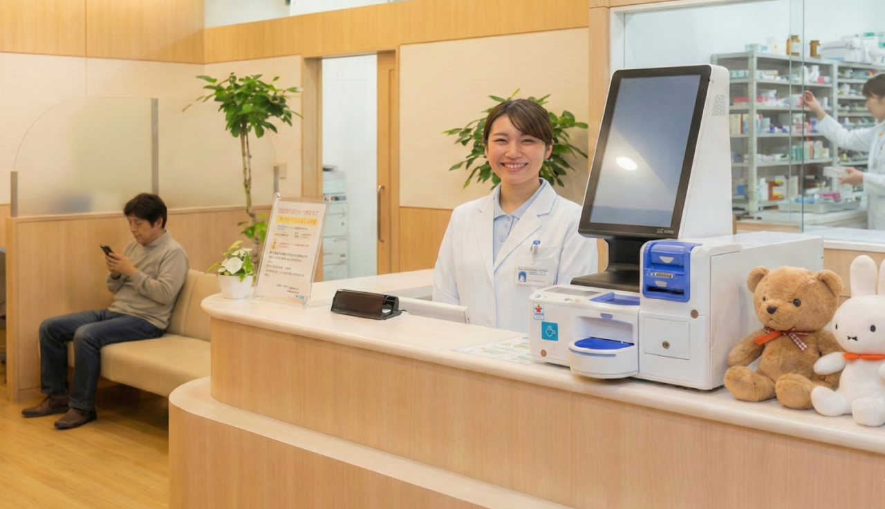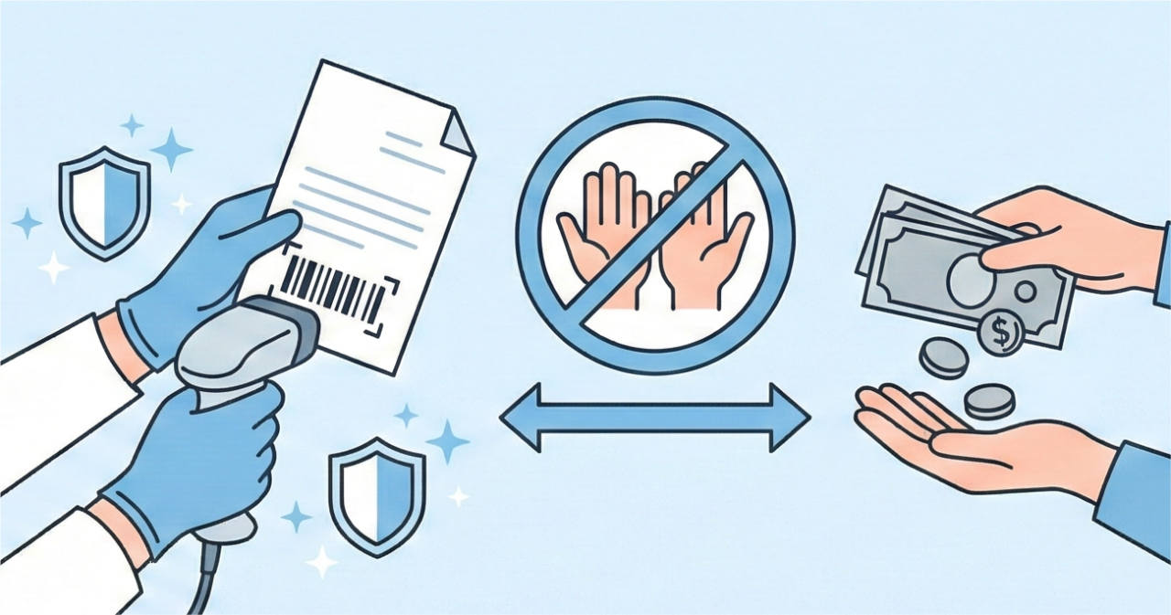スタッフさんはバーコードを読み取るだけ。現金の投入・精算は患者様自身が行うため、スタッフさんが現金に触れることはありません。清潔な手で投薬指導に集中できます。